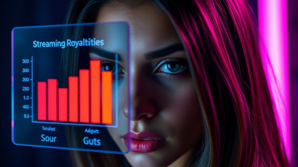 Olivia Rodrigo’s rise to fame has not only captivated fans worldwide but also highlighted the significant income she earns from streaming royalties. When you listen to her hit songs on platforms like Spotify or Apple Music, you’re tapping into a system rooted in music licensing and royalty calculations. Every time her tracks are streamed, a portion of the revenue gets distributed to her as royalties. These calculations are complex, involving factors such as subscription fees, ad revenue, and the platform’s sharing agreements. As a listener, you might not realize how your streaming contributes to her earnings, but it’s a vital part of how artists like Olivia monetize their music in the digital age.