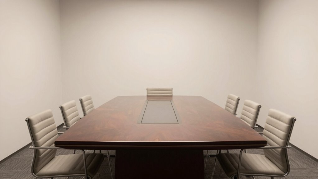 Ironically, choosing materials like glass or sleek metal makes conference tables seem less bulky. Light material textures and neutral color schemes reflect more light, creating an illusion of openness. These choices help small rooms feel larger, as transparent or shiny surfaces don’t dominate the space. So, go for glass tops or slim metal frames with subtle hues to make your conference table blend seamlessly, enhancing roominess instead of shrinking it.