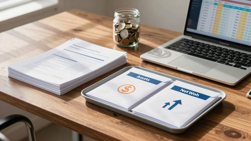 To separate these properly, start by tracking your income streams. Keep detailed records of your earnings from all sources. This clarity helps you understand how much money you have available for savings, investments, or debt repayment. Next, list all your assets with their current market values. Regularly updating this list guarantees you see how your investments grow over time and helps you develop sound investment strategies. For example, focusing on diversified assets like stocks, bonds, and real estate can maximize growth while managing risk. Knowing your assets allows you to plan for future needs, whether it’s saving for retirement or buying a home. Understanding the relationship between income, assets, and net worth helps you see how your financial actions influence your overall health. Recognizing the importance of accurate valuation is also crucial for making informed decisions about your wealth. Additionally, understanding how to properly account for liabilities and debts ensures you have a comprehensive picture of your financial position.