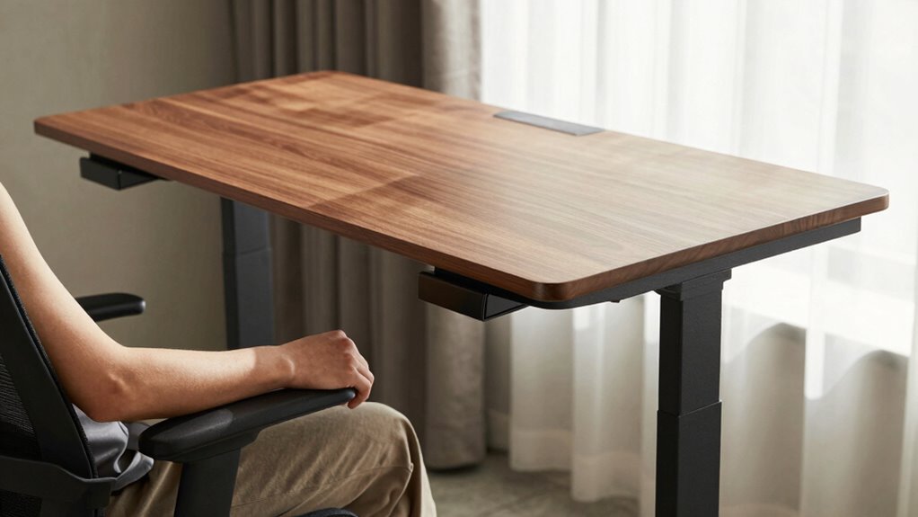 To set your standing desk height for maximum comfort, start by adjusting it so that your elbows are bent at roughly a 90-degree angle when your hands are on the keyboard. This aligns with ergonomic principles, promoting proper posture and reducing strain. Remember, desk customization is key; your desk height should support your natural arm position without forcing you to reach up or down. Ascertain your wrists stay straight and your shoulders relax. Your monitor should be at eye level to avoid neck strain. Fine-tune the height gradually, making small adjustments to find the most comfortable position. Incorporating ergonomic principles ensures your setup supports healthy posture and minimizes discomfort, helping prevent fatigue and injury. Pay attention to desk height adjustments to optimize comfort and efficiency. Proper ergonomic setup involves considering your overall workspace arrangement, which can significantly impact your comfort and productivity. Being aware of proper workstation ergonomics can further enhance your posture and reduce the risk of musculoskeletal issues. Small changes in desk ergonomics can lead to substantial improvements in comfort throughout your workday. Prioritizing ergonomic principles and desk customization helps prevent discomfort, improves focus, and encourages healthy standing habits throughout your workday.