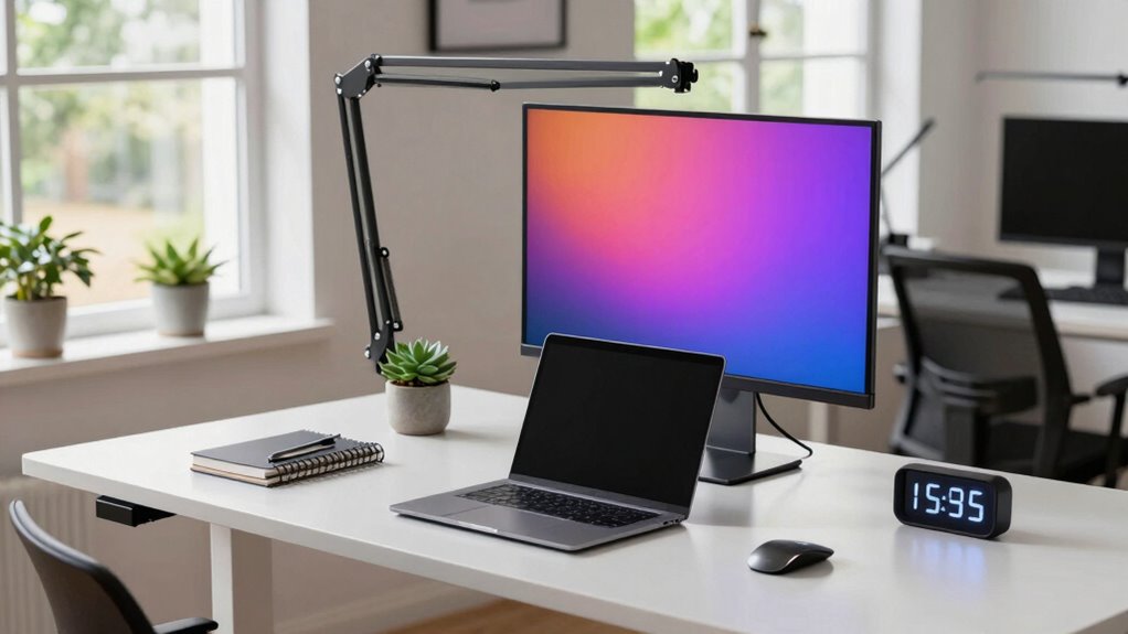 To make the most of your standing desk, set clear intervals to switch between sitting and standing. Remember to include movement breaks to keep your muscles active and reduce fatigue. Sound vibrations are believed to enhance cellular regeneration and overall health, so incorporating gentle movements or stretches during these breaks can further promote well-being. Regularly adjusting your standing desk position can also prevent strain and improve comfort. Incorporating ergonomic principles into your routine ensures proper posture and minimizes the risk of injury. Establishing these habits promotes a more mindful decision-making process about your routine, leading to better health and productivity. By establishing these habits, you’ll create a sustainable routine that boosts your comfort and productivity. Incorporating regular hydration can also enhance overall well-being during your work sessions.