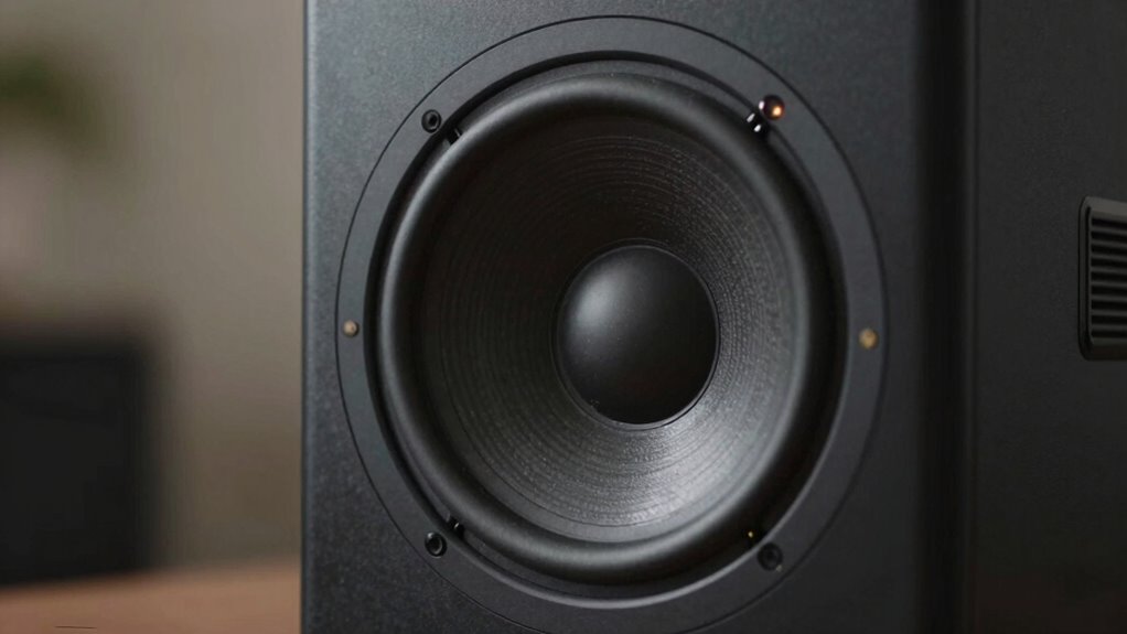 To achieve tight, balanced bass from your subwoofer, focus on fine-tuning its settings and placement with precision. Proper woofer placement can reduce boomy sounds and improve clarity. Pay attention to room acoustics, as reflective surfaces and corners may amplify bass unevenly. Adjust the volume, crossover, and phase controls to match your main speakers and room environment. Moving the subwoofer slightly can dramatically change sound quality—test different spots for ideal performance. Keep these factors in mind: