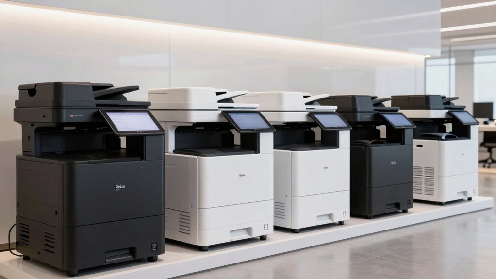 Imagine a quiet river flowing smoothly—these all-in-one laser printers are just as gentle on your energy bills. I’ve found they’re remarkably efficient, often sipping power only when actively printing or scanning. With eco-friendly features like sleep modes and energy-saving settings, they minimize waste. So, you get excellent performance without draining your resources, making them a smart, sustainable choice for your office or home.