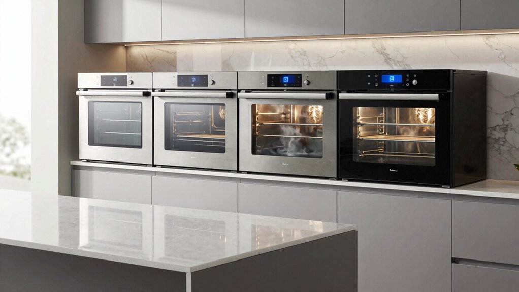 Imagine a quiet kitchen suddenly filled with a gentle hum—that’s how noise levels vary across steam oven models. Some operate almost silently, perfect for early mornings, while others emit a noticeable sound during operation. I’ve found that higher-end models tend to be quieter, creating a peaceful cooking environment. So, if silence matters to you, look for ovens with low decibel ratings—your kitchen’s tranquility depends on it.