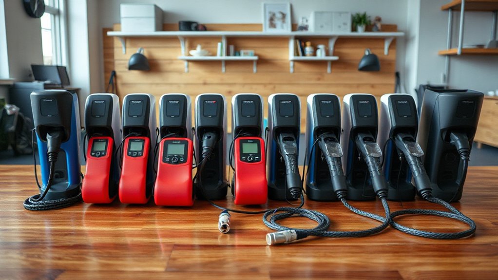 Selecting a portable Level 2 EV charger isn’t just about power and speed; how easy it is to carry and set up matters just as much. A lightweight design, ideally under 15 pounds, makes transportation simple. A long, flexible cable—around 20 to 25 feet—provides the reach needed for various parking setups. Compact dimensions and included carrying cases or bags make storage and travel effortless. Durable construction with weather-resistant materials guarantees the charger can handle outdoor conditions without damage. Features like easy-to-use handles, versatile mounting options, and simple plug-in interfaces further enhance portability and user convenience. When choosing a charger, prioritize thoughtful design elements that make setup quick and hassle-free, especially if you plan to use it in multiple locations.