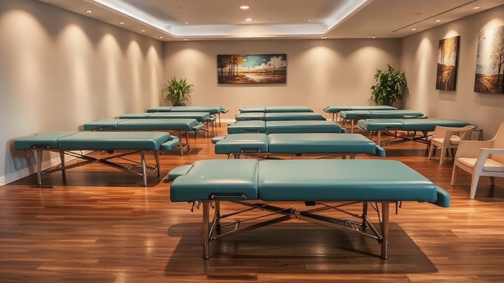 A massage table’s versatility can considerably enhance its value by supporting a variety of treatment techniques like facials, Shiatsu, Reiki, and general massage. I look for tables with adjustable height and headrest positions to customize each session for different clients and practitioner preferences. A foldable or portable design is essential if I need to work across various locations, from spas to mobile setups. Compatibility with accessories such as armrests, face cradles, and side pouches adds to a table’s adaptability, allowing me to tailor treatments easily. Additionally, the construction materials and weight capacity must ensure stability and durability, capable of handling diverse client sizes and treatment types. This versatility ultimately helps me serve clients better and expand my practice’s offerings.