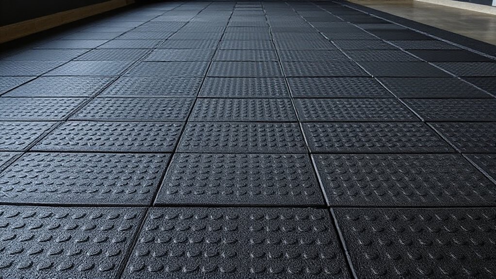 Ensuring safety and traction in rubber gym flooring mats is essential for preventing slips and injuries during workouts. Mats with textured surfaces or embedded anti-slip materials offer superior grip, especially during dynamic exercises. The thickness, typically between 0.4 and 0.79 inches, plays a key role in providing stable footing and reducing accidents. High-friction mats with non-slip rubber tops are crucial for heavy lifts and high-intensity interval training, where stability is indispensable. An interlocking design that fits securely prevents shifting or bunching, maintaining consistent traction throughout your session. Additionally, choosing non-toxic, odor-free rubber mats enhances safety by avoiding harmful VOCs or chemical fumes. Prioritizing these features ensures a safer, more secure workout environment.