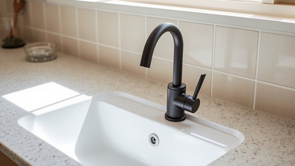 Choosing the right finish for your touchless kitchen faucet is essential because it directly affects its appearance and how well it resists fingerprints, water spots, and corrosion. Popular options like stainless steel, brushed nickel, matte black, and bronze each offer unique styles and maintenance needs. A sleek, modern finish such as stainless steel complements contemporary kitchens, while traditional finishes like bronze suit vintage or classic decor. The durability of these finishes is often tested to make certain they withstand daily wear and cleaning. Matching your faucet’s finish with existing fixtures and appliances helps create a cohesive, visually appealing space. Ultimately, selecting the right finish balances aesthetic preferences with practical considerations, ensuring your faucet remains beautiful and functional for years to come.