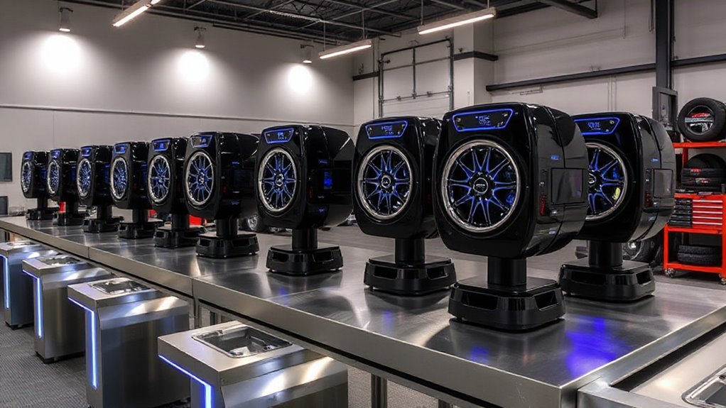To keep your wheel balancer performing like a precision instrument, I recommend regular calibration, at least every few months, and thorough cleaning after each use to prevent dust buildup. You should also check for worn belts or sensors periodically, as neglecting these can turn your high-tech machine into a sloppy mess. Proper maintenance guarantees it stays accurate, reliable, and ready to keep your wheels perfectly balanced for the long haul.