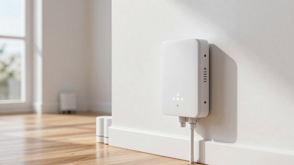 Choosing a whole home leak detection system hinges on understanding its detection range and coverage. The detection range determines how far sensors can monitor water leaks from the central hub or controller, directly impacting coverage. For larger properties, sensors with extended wireless range capabilities, like LoRa or Sub-1G technology, are essential for reliable communication over long distances. The number of sensors needed depends on your home’s size and layout, so guaranteeing they connect effectively is vital. Some systems offer multi-zone detection with expandable range, ideal for multi-floor buildings or outbuildings. Proper sensor placement within the detection range is essential, especially in areas prone to leaks or hard-to-reach spots. Adequate coverage ensures comprehensive protection and peace of mind.