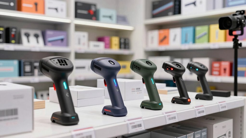 When choosing a wireless barcode scanner, I need to pay close attention to its storage capacity and data management features. I look for devices with sufficient internal storage, usually between 4MB and 16MB, which can hold up to 100,000 barcode entries offline. Seamless data synchronization is vital, so I prefer scanners that automatically update once reconnected. Supporting multiple libraries or data groups helps me organize inventory categories efficiently. Offline data collection is a big plus, especially in areas with limited connectivity, making sure operation is uninterrupted. Ultimately, easy export options for stored data through compatible software or direct connections streamline inventory tracking. These features guarantee my scanner can handle large amounts of data while keeping inventory information accurate and accessible.